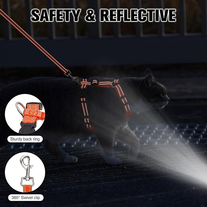 - [REFLECTIVE CAT HARNESS] The reflective trims of the pet vest harness and leash ensure good visibility at night, safe and fashion while out for a walk; This cat harness and leash for walking escape proof is ideal for daily walking, jogging, training, and any outdoor recreations. Also a great cat harness when you're taking your kitty to an unfamiliar place, such as the vet or groomer.