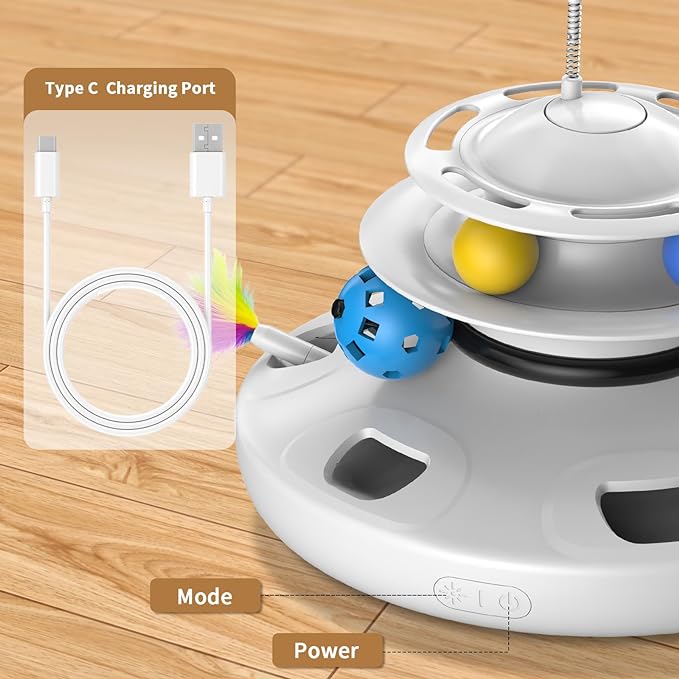 - The cat automatic toy can be more attractive for cats, more rolling balls on the toy, and it is allow up to 3 cats to play together! Comes with Accessories: Bottom Feather * 3 (One is preinstalled), Butterfly Cat Wand * 1, Track Ball * 4 (A bell ball is included), Type-C Cable * 1