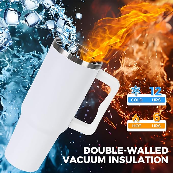 40 oz Tumbler with Handle and Straw Lid Insulated Cup Stainless Steel Water Bottle Travel Mug Cupholder Use Gifts for Women Men Kids Trek Collection White