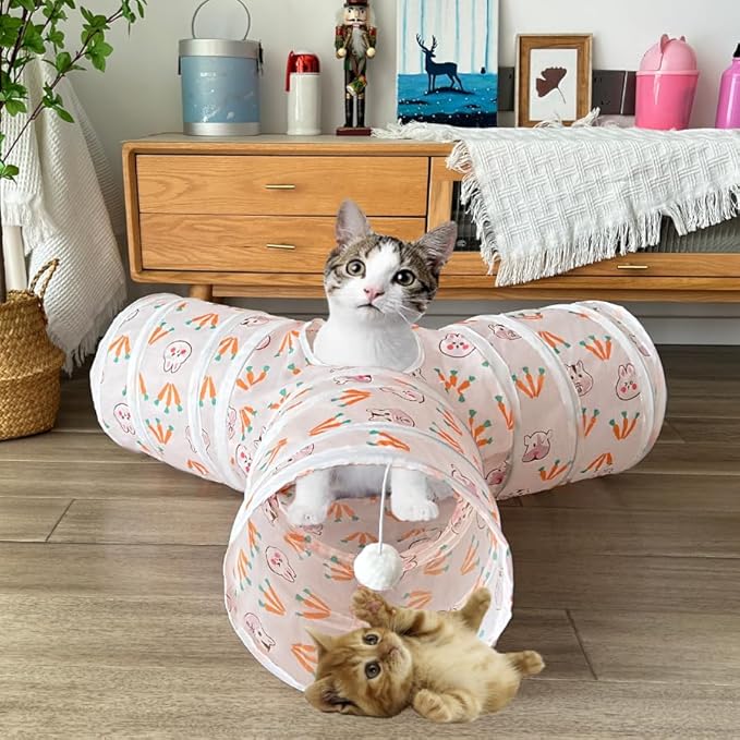 Cat Tunnel Tube Toys, Rabbit Pattern Tunnels for Indoor Cats, 3 Way Collapsible Interactive Toy Maze House with Peek Hole Dangling Ball for Rabbit, Kitten, Kitty, Puppy
