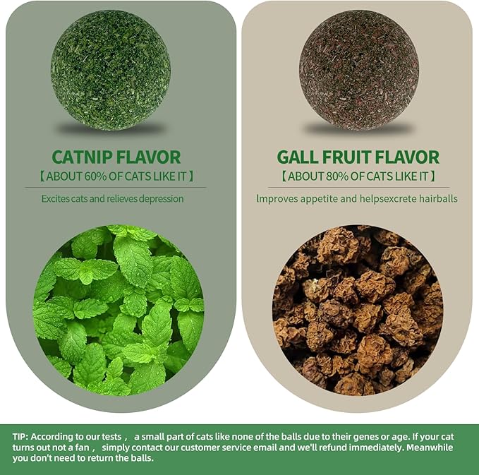 - 【Two flavors of lickable cat food】 If your cat doesn't like the catnip ball, try switching to the gall fruit ball. Our product comes in a set of 2, each with 2 replacement balls—one catnip ball and one gall fruit ball (inside the product, which can be removed by opening). These replacement balls are designed to attract your cat to rub against them, making them perfect cat enrichment toys for indoor cats.