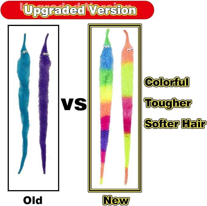 - 🎃【VARIOUS APPLICATIONS】 The rainbow fuzzy worm trick toys are wonderful magic prop, can attract audience's attention and interest. Also can be used as cat toys. Cat will be happy to chase worm. Moreover, they are perfect for craft applications such as diy earrings, room decor and car decor, or embellishment on your clothes. The rainbow worms on string bulk your good friend. These are fuzzy worm toys are looking for new homes!