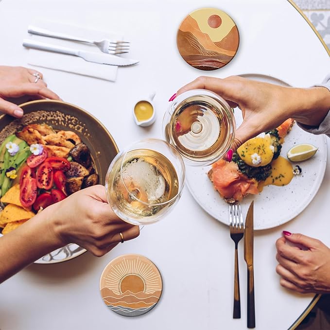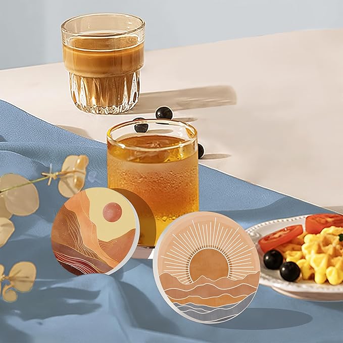 - Husiti Ceramic Coasters Set With Metal Holder: Keep Your Dining Table Stylish And Organized With This Set Of 6 4-Inch Round Coasters Featuring a Trendy Boho Mountain Sun Pattern.