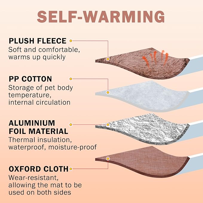 - WARM AND SAFE: This cat heated bed is made of simulated high-quality plush, double-filled pp cotton, soft and breathable. This self-heating cat/dog pad reflects and retains your pet's own body heat, keeping them warm and comfortable