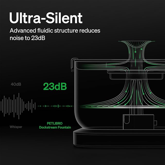 - Silent - Sleep soundly even if Dockstream’s right next to your bed. The advanced water flow structure filters out noise so the entire cordless water fountain for cats indoor clocks in at a barely audible 23dB - quieter than a whisper