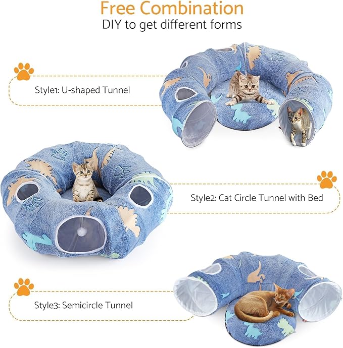 - 3-in-1 Multi-Functional Design: This foldable cat tunnel features two half-circle tunnels and a washable round mat, which can be combined into a half-circle or U-shaped tunnel. The zipper connection makes the structure more sturdy, providing various play options for your cat. The soft round mat in the middle offers a cozy spot for rest or sleep