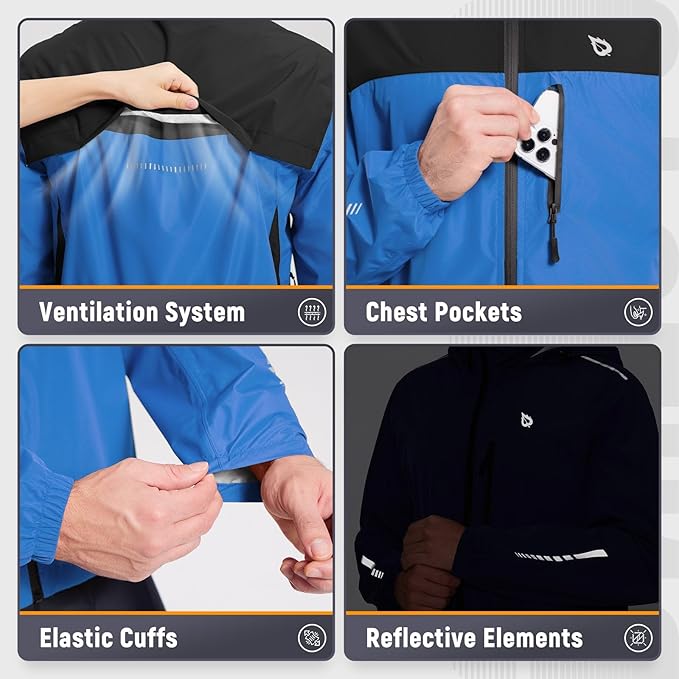 - Packable Hood: Mens cycling rain jackets with hood features drawstring, large enough to accommodate road riding and climbing helmets. The hood can be tucked into a velcro compartment by the collar when not in use.