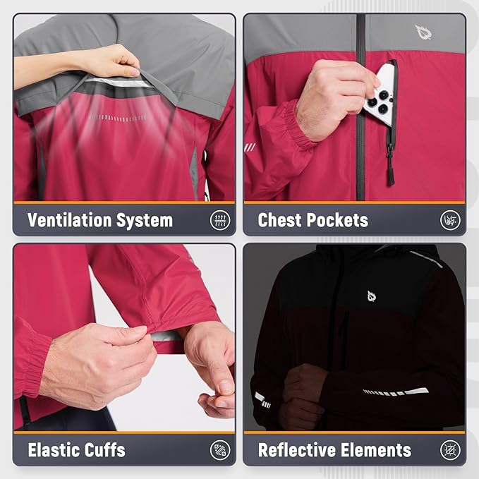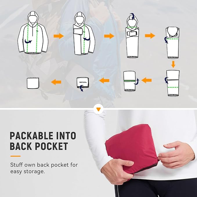 • Packable Hood: Mens cycling rain jackets with hood features drawstring, large enough to accommodate road riding and climbing helmets. The hood can be tucked into a velcro compartment by the collar when not in use.