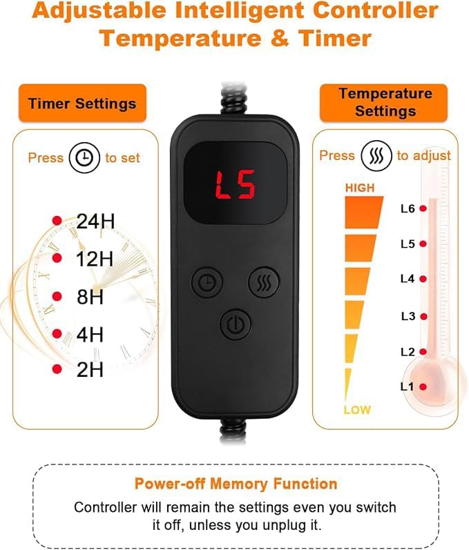 - Our heating pad offers a temperature control with 6 settings ranging from 86 to 131℉ (30 to 55℃). It features a 5-level timer (2/4/8/12/24 hours) that turns off automatically when time is up. Easily monitor the time with the indicator light that moving down every 4 hours to show how much time is left.