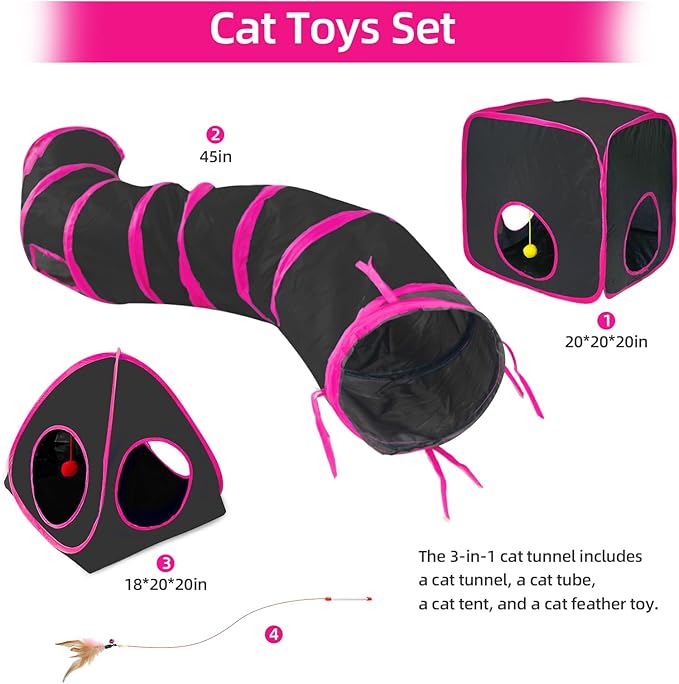 - 【3-in-1 Design】This cat toy set includes a cat cube, a cat tunnel, a cat tent, a feather cat toy, and a convenient handbag. It is an upgrade to the traditional cat tunnel and is also very easy to use. You can also bring it outdoors or on a trip to provide a place for your cat, rabbit, guinea pig, and puppy to rest and play.
