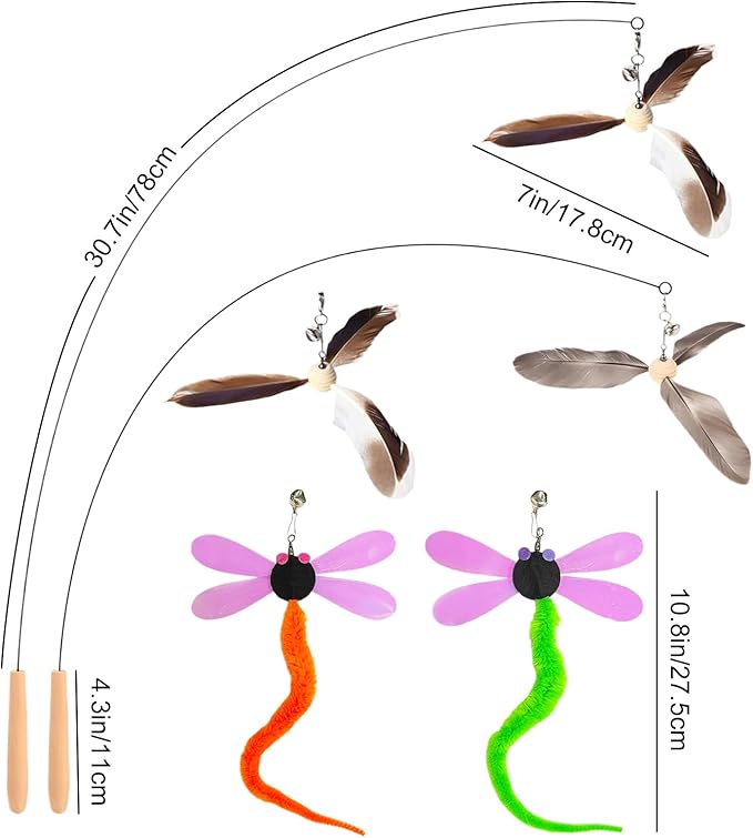 - 【5PCS Feather Replacement Accessories】Our set includes 3 propeller design natural feather refills and 2 colorful long-strip feather refills, they are all equipped with bells. These feather refills are designed based on birds and dragonflies, when "lure" the cats, they will look like a real bird flying in the air. There also has a metal clasp design that is easy to open and close for easy replacement.