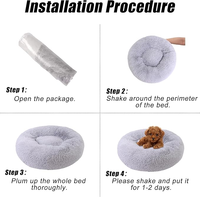 - 【How to Restore Fluffy】Our donut dog bed are vacuum packed with very good pp cotton, calming dog bed will be compressed during transportation, please air dry the round dog bed in a sunny place for 24 hours before use. After air drying, pat and shake the puppy bed to restore its fluffiness. Or put the ped bed in the dryer at the low temperature drying for a few minutes, then give it a gentle pat and shake, and the soft dog bed will become completely fluffy.