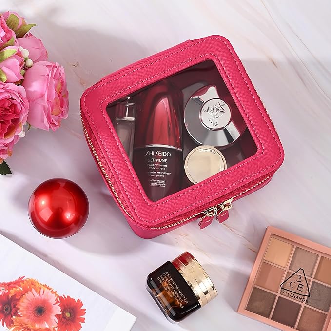 - ❤【LUXURY DESIGN】Unlike other flimsy clear makeup bags, our mini cosmetic case(measuring 5.2’*4.8’*2.6’) which made of premium saffiano PU leather and thick vinyl can keep a good structure and. The mini clear make up bag was designed into a minimalist boxy shape, crafted in beautiful PU leather and finished with polished hardware. Together with the beautiful stitches and whisper-quiet metal zippers, it’s durable for long-lasting use