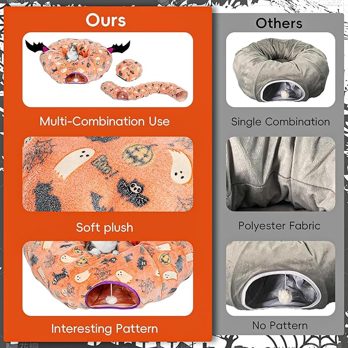- Halloween Bat Wings Design: Unique bat wings design makes the cat tunnel more fun, removable to wear on the cat, ball toy on the peekaboo cat cave satisfy the cat's desire to play, let your cat enjoy Halloween too. Spider web, pumpkin and ghost pattern on the cat couch mat add to the holiday atmosphere