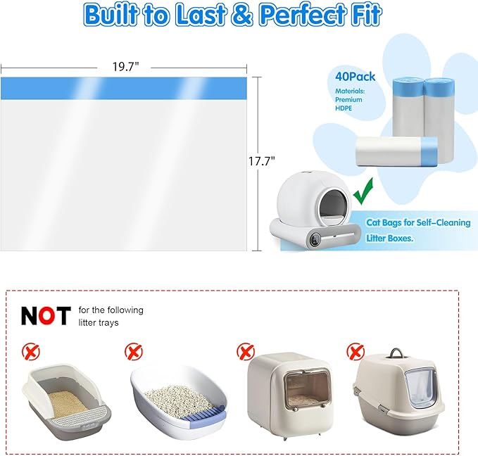 - Durable Materials: Crafted from robust HDPE plastic, Automatic litter box bags are 30% thicker (1.5 MIL) than standard bags, offering exceptional tear resistance and durability. With a maximum load capacity of 22Ibs, they prevent leaks and ensure no cat litter escapes. Cat litter bags are designed to handle heavy use while keeping your automatic cat litter box self cleaning and hassle-free.