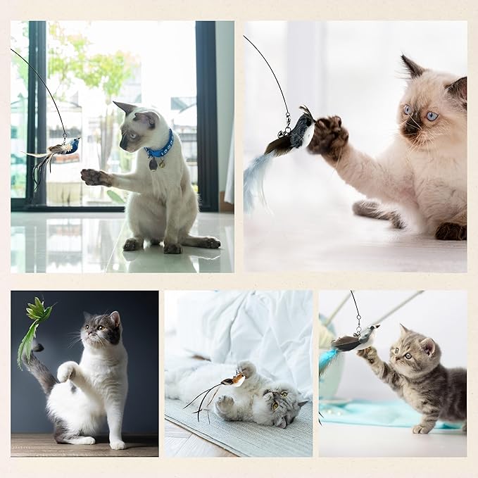 - Engage Your Cat's Instincts: This interactive feather cat toys mimics real prey with its natural feathers and jingling bells, sparking your feline's curiosity and providing endless entertainment. The feathered birds move in a lifelike, fluttering motion, mimicking and triggering your cat's natural hunting instincts, turning any room into a thrilling playground and helping keep your indoor cat active and entertained.