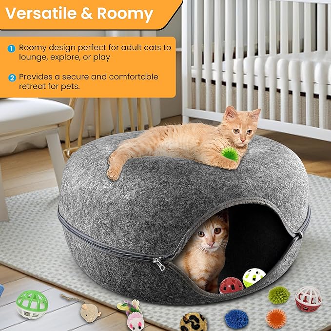 Cat Tunnel Bed – Large Cat Donut Tunnel with 12-Pcs Cat Toy Set – Soft Felt Cat Caves for Indoor Cats with Upgraded Zipper – Scratch-Resistant Cat Cave Bed – Comfortable Peekaboo Cat Cave