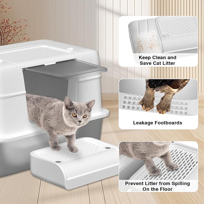 - 2.【3-in-1 Detachable Design】This litter box features a three-part detachable design to suit your cat's preferences.The fully enclosed setup prevents odor from spreading, effectively stops urine leaks, and provides privacy for your cat.The semi-enclosed setup promotes ventilation, making it easier for owners to clean.