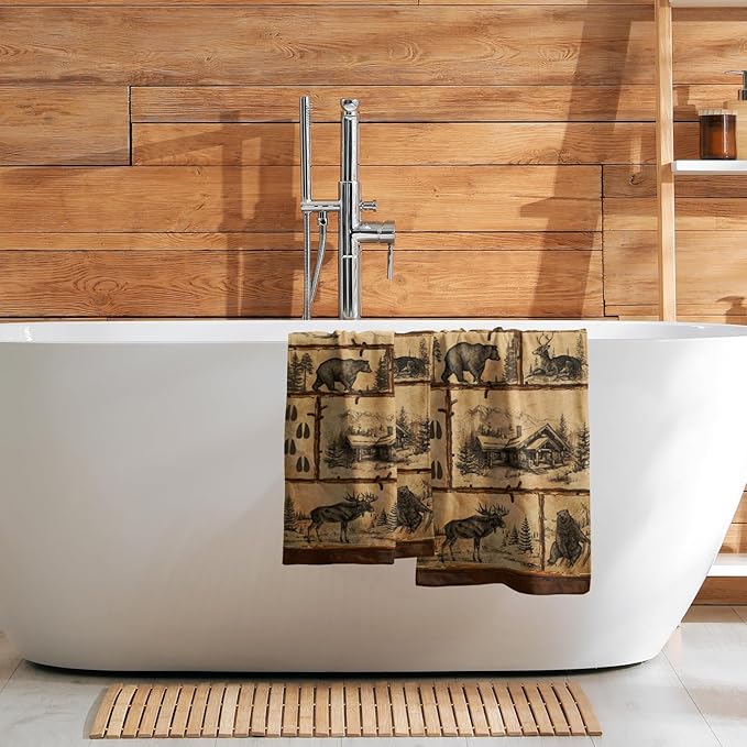 Giwawa Vintage Bear Deer Hand Towels Set of 2 Forest Cabin Face Bath Fingertip Towel Soft Absorbent Dish Wash Cloth Kitchen Bathroom Home Decor