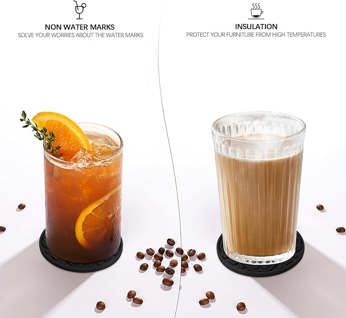 - Protects All Surfaces: Each coaster features a soft yet durable silicone surface that protects your tabletops from water rings, heat, and scratches. Great as coasters for coffee table, cup coasters for table, or desk coasters for office
