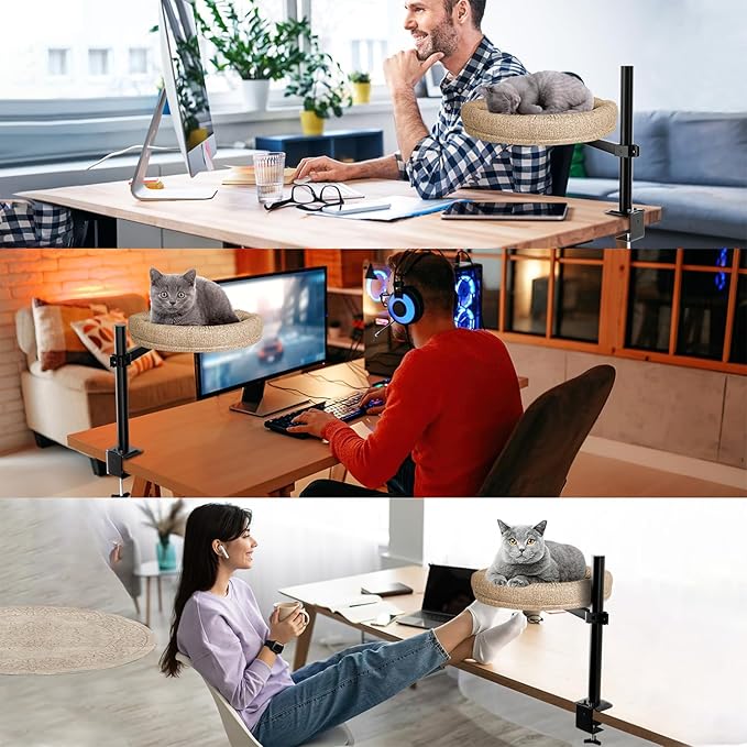 - 360° Rotation & Adjustable Height: Our cat bed desk offers a unique 360° rotation and adjustable height feature. The bed can spin around the post and be set to the perfect height, ensuring it fits seamlessly into your workspace. This functionality provides a comfortable spot for your kitty while keeping your desk organized