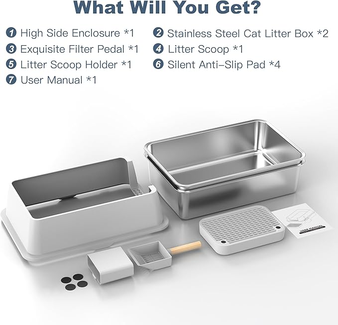 - ๐๐๐๐ค๐๐ ๐ ๐๐ข๐ฌ๐ญ: 2x Stainless Steel Litter Pan; 1x ABS lid; 1x Pedal ; 1x Scoop ; 4 x Anti-slip Mat ; 1x User Manual.