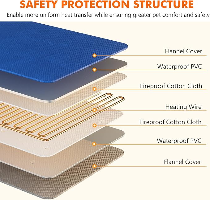 - SAFETY & SECURE STRUCTURE: MET Certified for peace of mind. The cat heating pad features a multi-layer protective structure with thickened soft PVC outer shells, built-in fire-resistant cotton materials, and fully sealed technology. It is equipped with waterproof, power leak-proof, and fire-resistant functions to protect your pets from burns.