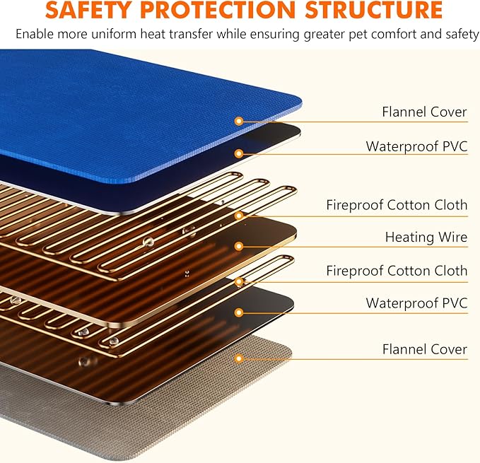 - SAFETY & SECURE STRUCTURE : MET Certified for peace of mind. The cat heating pad indoor features a multi-layer protective structure with thickened soft PVC outer shells, built-in fire-resistant cotton materials, and fully sealed technology. It is equipped with waterproof, power leak-proof, and fire-resistant functions to protect your pets from burns.