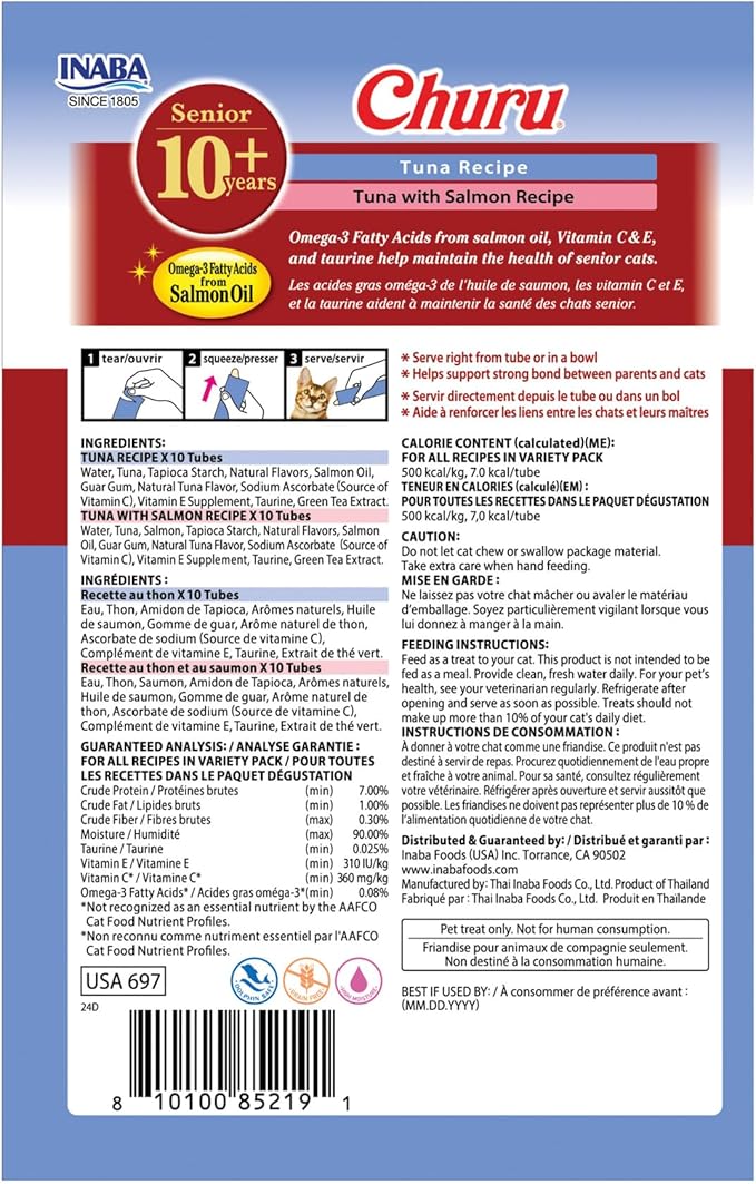 - SUPPORT HEALTHY AGING: Your feline friend is important to us, which is why Churu for Senior has added Omega-3 from salmon oil to support brain & cognitive function, Taurine for their overall health, and Vitamin E & C to help boost their immune system