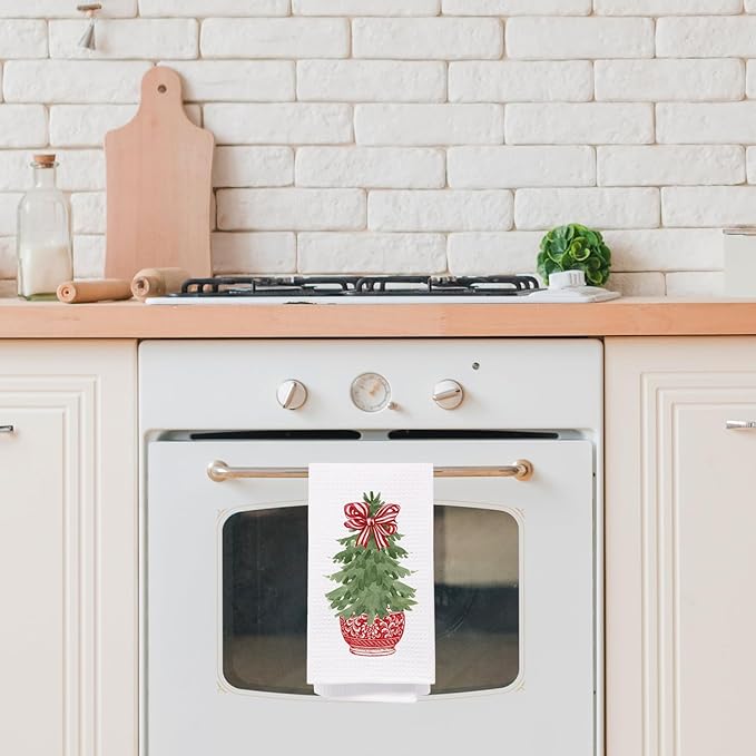 Chinoiserie Christmas Tree Kitchen Towels, Red Stripe Bow Decorative Hand Towels for Bathroom, Dish Towels for Kitchen and Bathroom Decor, 16x24 Inch