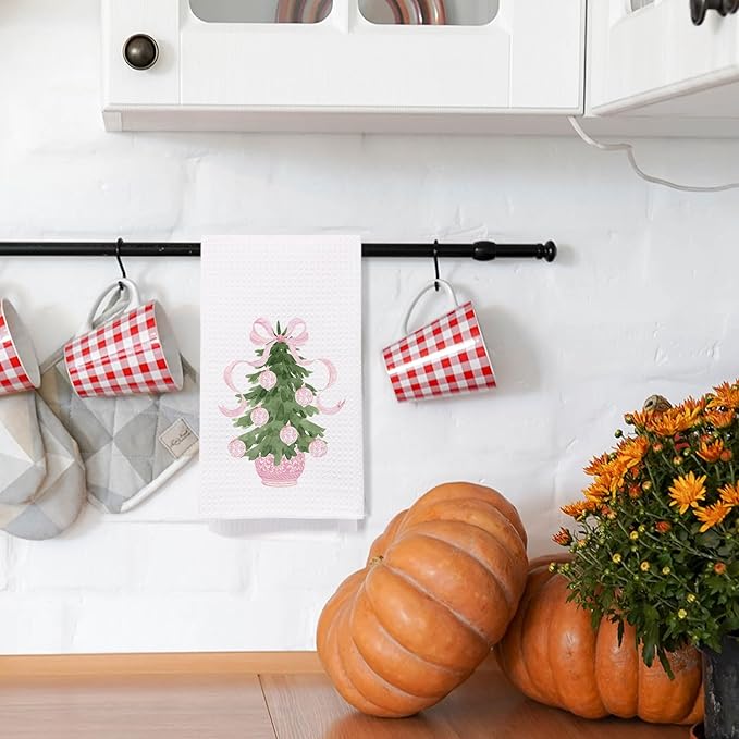 SPBL&L Chinoiserie Christmas Kitchen Towels, Pink Bow Tree Decorative Hand Towels for Bathroom, 16x24 Inch