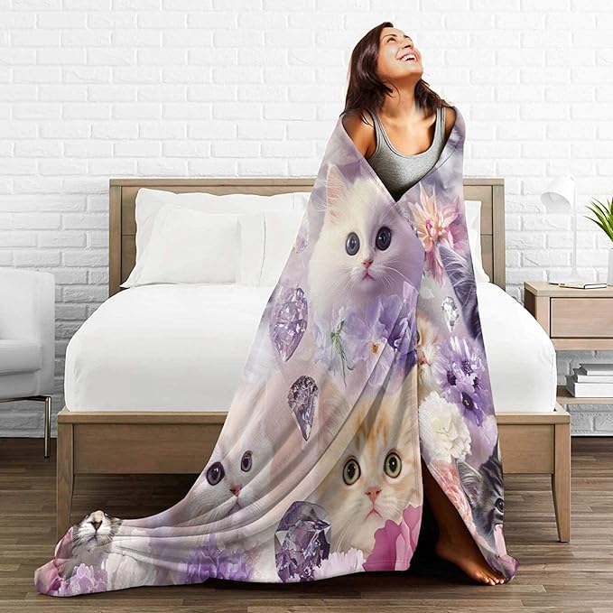 Kawaii Cat Blanket - Soft Cozy Kitten Plush Throw Blanket, Super Warm Fleece Fuzzy Bedding Blanket for Kids, Girls, Boys, Women Bed Decor Stuff, 60"X80