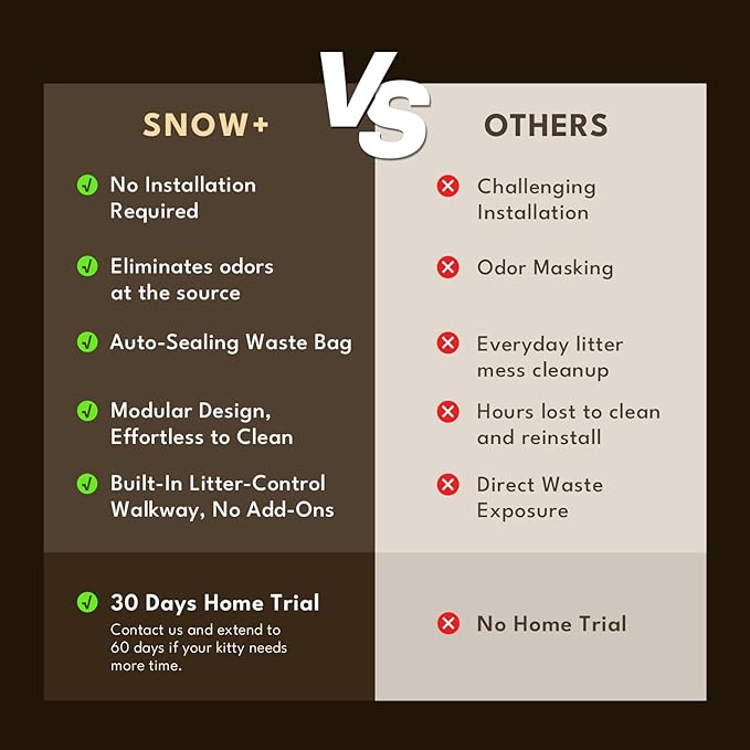 - Effortless Setup: Simply lift the top cover, add fresh litter, and let SNOW+ do the rest! No assembly needed, easy disassembly in 30s. Our self cleaning cat litter box automatically scoops, collects, and seals waste in liners. Maintaining a clean litter box is now a breeze