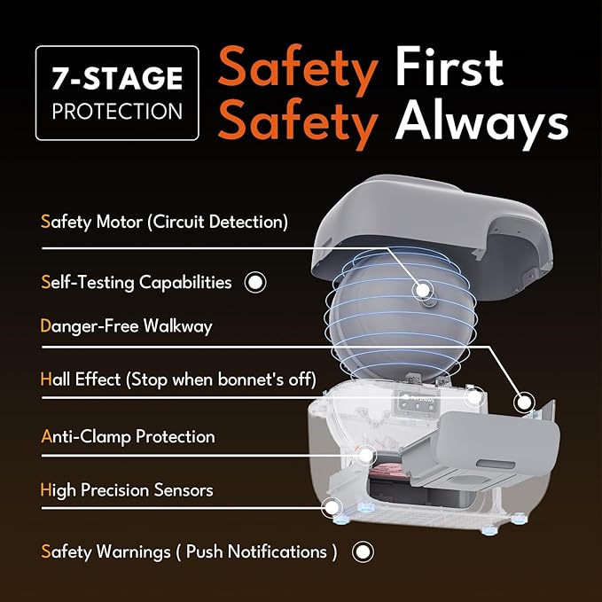 - Effortless Safety: Rest assured that your furry friend is always safe with 7 stages of SnowSafe+ protection. When your cat enters the automatic cat litter box, the cleaning process will immediately pause. Note that cats under 3.3 lbs(usually under 6 months) are prohibited from using this litter box