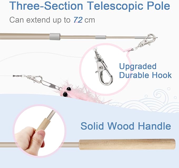 - [CONVENIENT CAT WAND] The retractable cat wand is durable. It comes with a solid wood handle. The pole is flexible and retractable, it can be stretched from 12.6 to 28 inches, easy to carry and store