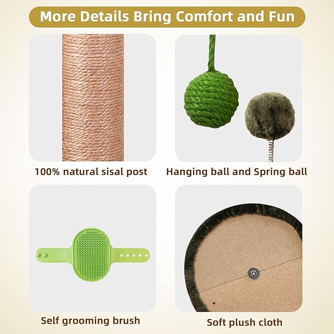 - SCRUBBER AND SENNA BALL: Cat scratching post with scrubber allows your cat to enjoy grooming, while keeping your cat's skin clean and healthy. The hanging sisal ball and spring-loaded ball with bell can add extra fun for your cat to play with.