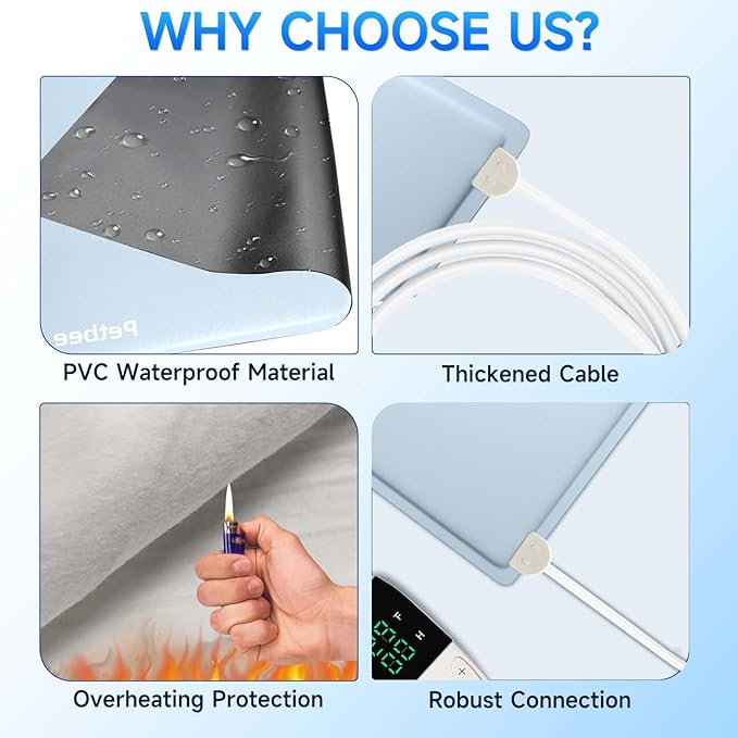 - SMART TIMER WITH AUTO SHUT-OFF – Equipped with a timer for intelligent power-off, this dog heating pad ensures safety and energy efficiency. Set it, and rest easy knowing it will automatically turn off after the timer expires.