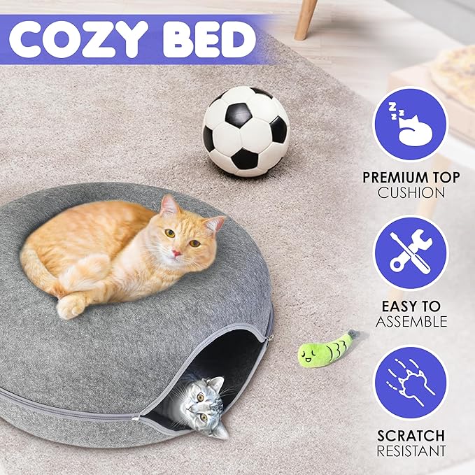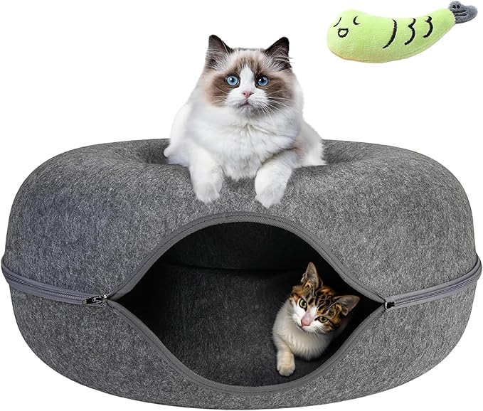 - 😸VERSATILE AND SEASON-READY - This cat tunnel bed for indoor use is crafted from durable felt and features a sturdy zipper. It's designed to be scratch-resistant, non-pilling, and completely safe for your feline friends. The bed is detachable and easy to clean (hand wash only), making it suitable for use throughout the year.