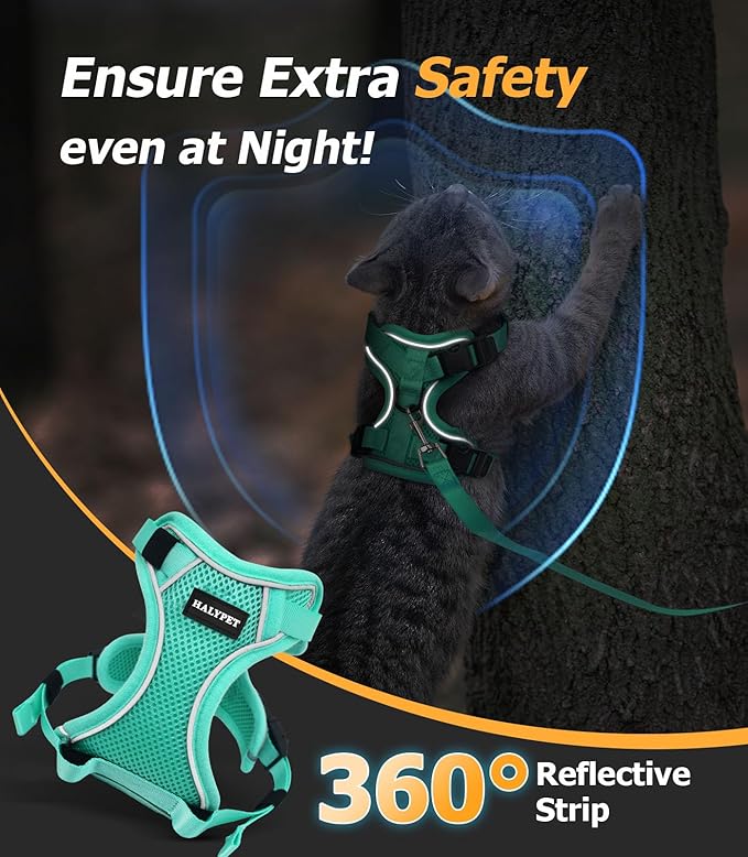 - [Ergonomic Design Cat Harness] Enjoy the well-built cat harness designed by Halypet! Our particular streamlined + 5 Pull dispersion points + D-ring cat harness design allows the tension from the cat leash to be evenly distributed across cats’ shoulders and chests, preventing cats from choking or neck strain, The reflective strips enhance visibility during evening walks. Safer compared to many traditional cat collars and cat harnesses on the market!