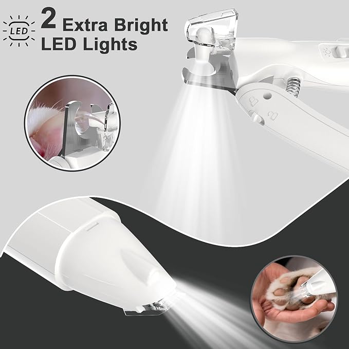 - 【Two LED Light】 Both the dog nail trimmers and dog paw trimmer ends are equipped with a highlighted LED light to illuminate the bloodline of light-colored nails, which allows you to trim your pet's nails safely and accurately. Trim your pet's nails and claw hair more clearly and safely, and do your best to protect your puppy from injury.