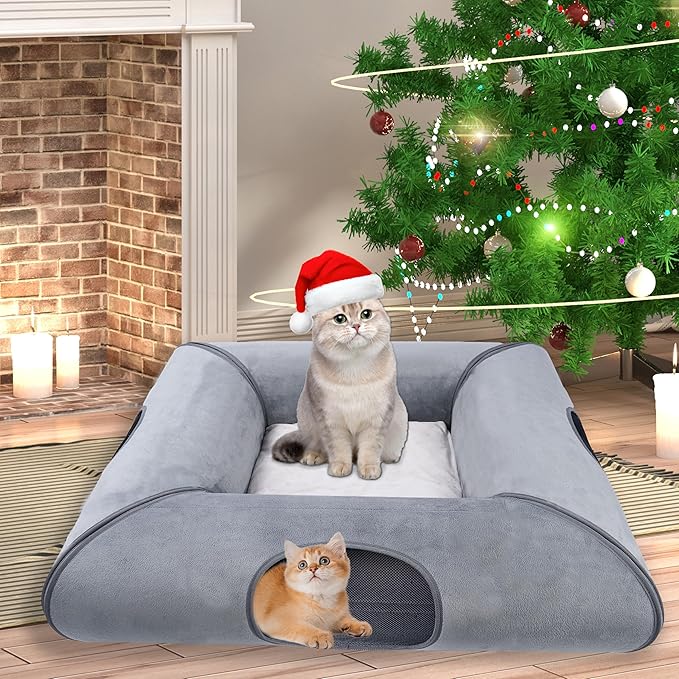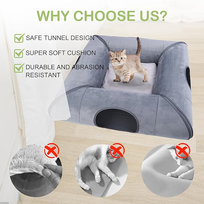 - 【Innovative Design】This uniquely designed square cat tunnel nest blends perfectly with home decor. Surrounded by shuttle tunnels with breathable windows, the spacious interior allows each kitten to stretch out and explore freely. The center is equipped with a resting soft cushion and the non-slip bottom ensures stable use on a variety of surfaces. This combination is perfect for multi-cat households, providing the ideal space for interactive play and comfortable lounging.
