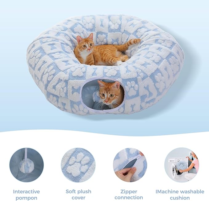 PEQULTI Cat Tunnel with Cat Bed for Indoor Cats, Cat Play Donut Tunnel with Washable Soft Plush Mat, Round Cat Tunnel Toys Cute Cat Tube for Kittens, Puppies, Rabbits and Ferrets, Blue