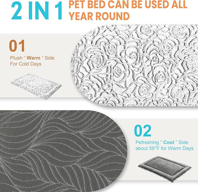 - 2 in 1 Reversible Dog Crate Bed - The high quality breathable side of kennel pads is made of skin friendly ice silk fabric can be used in summer time as a dog cooling mat for your pets. The other side of dog crate pad is soft and warm plush, suitable for other seasons