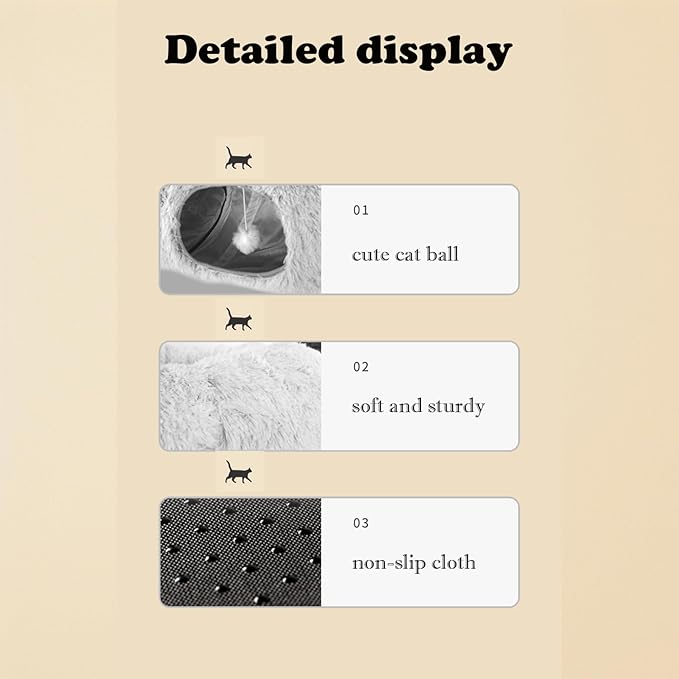 - High-Quality, Sturdy Material:Made from thickened plush fabric and a hardened metal frame, the tunnel is designed for durability and long-lasting use. The high-quality materials ensure stability, comfort, and safety, making it a reliable and enjoyable space for your cat to explore and rest.