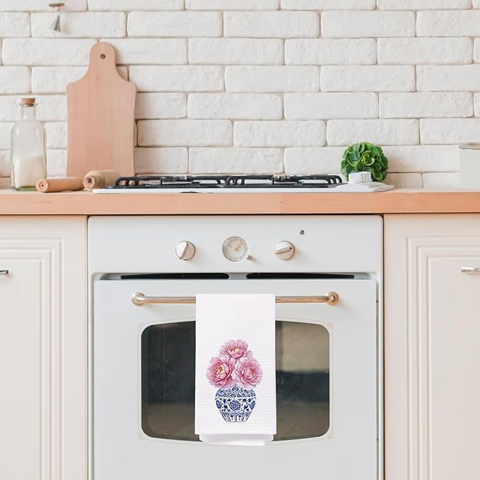 SPBL&L Chinoiserie Decor Kitchen Towels, Blue and White Chinoiserie Vase Pink Peonies Floral Dish Towels for Kitchen, Blue and White Hand Towels for Bathroom, Grandmillenial Decor, 16x24 Inches