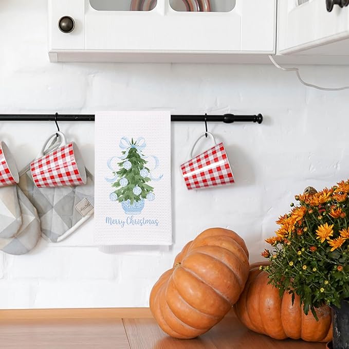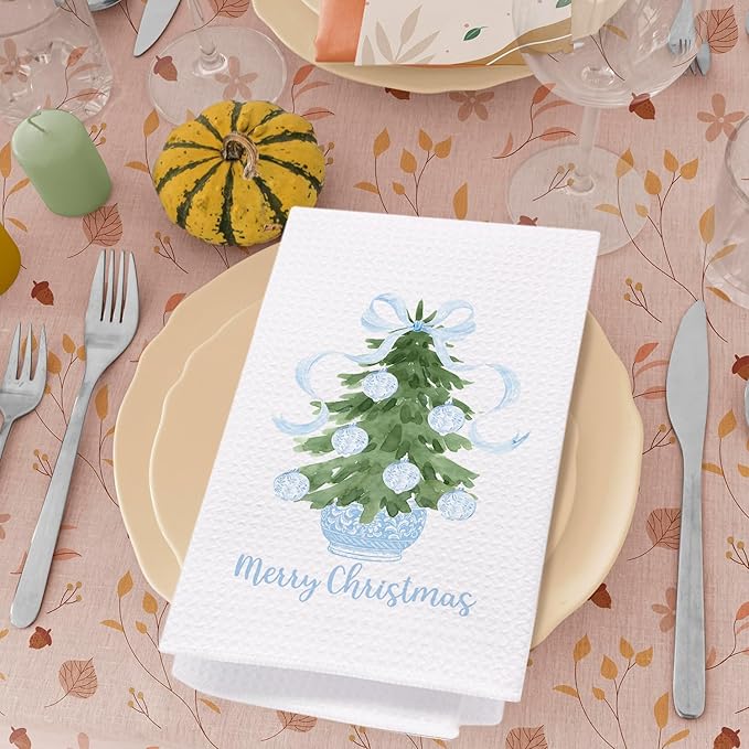 SPBL&L Light Blue Chinoiserie Christmas Kitchen Towels, Light Blue Bow Christmas Hand Towels for Bathroom, Chinoiserie Decor,Merry Christmas Dish Towels, Christmas Kitchen Bathroom Decor, 16x24 Inch