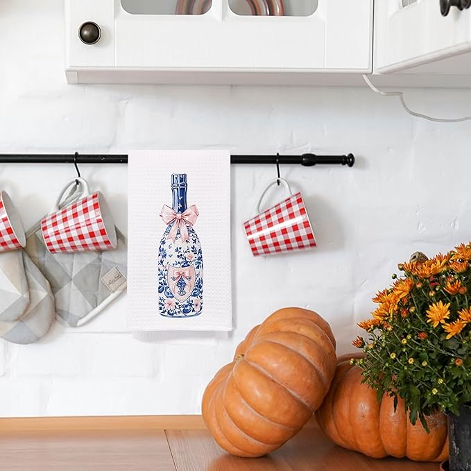 SPBL&L Chinoiserie Decor Kitchen Towels, Blue and White Chinoiserie Champagne Pink Bow Hand Towels for Bathroom, Grandmillenial Decor Dish Towels Tea Towels for Kitchen, 16x24 Inches