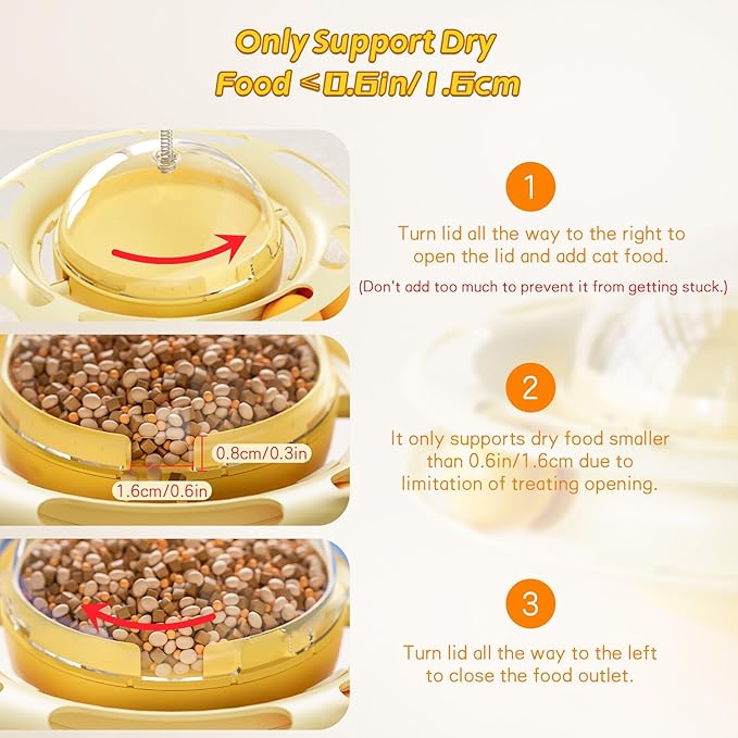 - Slow Food Dispenser Cat Feeder: Integrated slow feeder encourages your cat to eat at a slower pace, reducing the risk of overeating and aiding digestion. Turn lid all the way to the right to open and add dry cat food. Note: It only supports dry food smaller than 0.6in/1.6cm due to limitation of treating opening