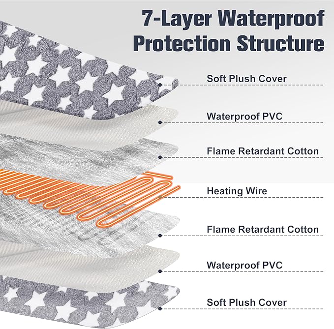 - 7-Waterproof Layer Protection Structure: Our Cat warm bed mat features a 7-layer protection structure, ensuring the safety and security of your beloved pets. with MET-certified heating wire protect pets from burns. The PVC inner with waterproof and flame-retardant function