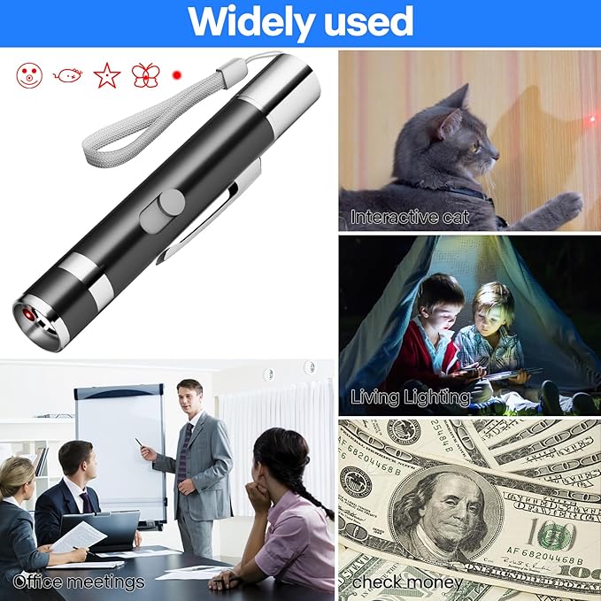 - 【Multi Function】This cat light toy is versatile and fun. It doubles as a bright pointer for presentations, offering clear visibility. The button works with a single push, so you don’t need to hold it down. It also has a glow-in-the-dark mode for added fun and a purple mode to detect counterfeit money. Perfect for both playtime and practical use!